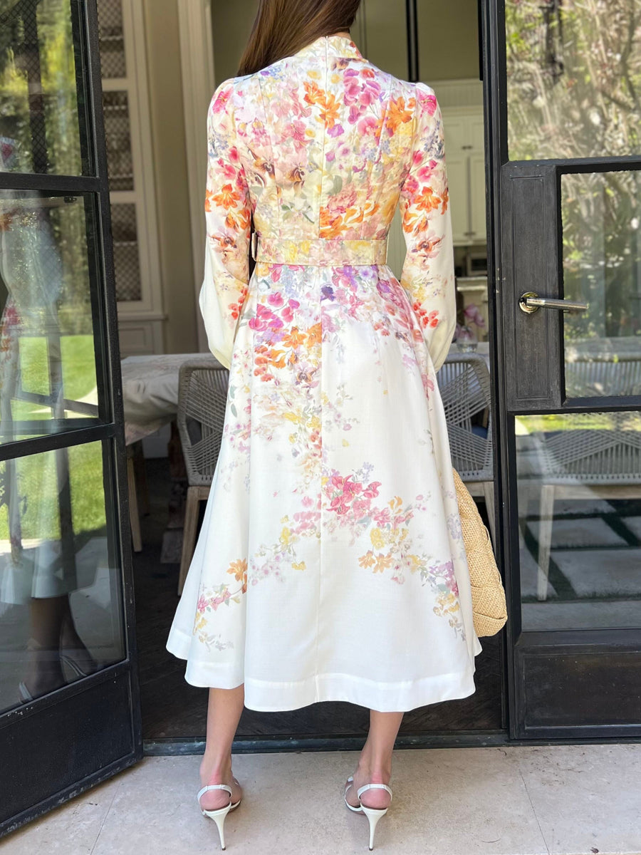 A linen long sleeve midi dress featuring a fitted bodice and full skirt with buttons down the centre front bodice